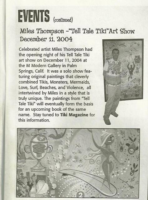 I'm looking to buy a Tiki Magazine vol #1 issue (Sping 2005). Yes, the premier issue of all things --I must be crazy. I want to read the article on Miles Thompson's, "Tell Tale Tiki" show at M Modern. I'm not picky about the condition, I just want to read the article.