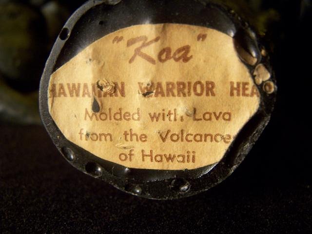 A little more commentary on this. Coco Joe and HIP each had kind of recognizable face styles when they sculpted humans - if you're a lava nerd like me, you can easily tell a HIP girl from a CJ girl. So, the typical CJ Kamehameha bust is easy to recognize without even looking for a marking, and these pieces are obviously very different from that. Poly Art is a little different because they produced some bizarro stuff that has nothing to do with their other items. Probably they had a number of different sculptors. So as Buzzy's pic shows, clearly there was somebody who sculpted a series of these busts with that same style as your pieces, including a female one with a very similar face. But I don't know if that's Poly Art, or maybe Holo Ka Hana (hafta ask Buzzy which one's which in his pic), or maybe totally unmarked. Could be these busts predate the whole CJ/HIP era. Or maybe Freddie House of Ku knows more. He knows everything about this stuff! BTW, those feather helmets they wear are called mahi'ole. -Randy |