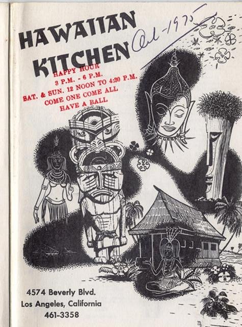 I started looking at the LA Public Library webpage after Abtractiki posted a Bahooka menu and I found a nice menu from the Hawaiian Kitchen that was full Tiki. Anybody recognize this cover?