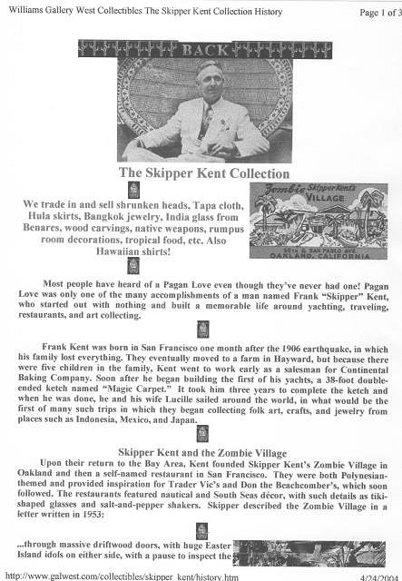 Indeed, it is great when collectors and scholars from outside the Tiki community join in and contribute. I just noticed that two of the most important TC threads on Skipper Kent are not linked here. On top of the valuable findings by Trad'r Bill and DustyCajun, some of the best material was unearthed by Bifcozz. I am really saddened by his recent passing, and just want to re-iterate that his paper ephemera posts on Frank Kent are some of the most elaborate postings on TC ever, in my opinion. Here is the one on Zombie Village: http://www.tikicentral.com/viewtopic.php?topic=22238&forum=2&vpost=515175 ...and here are pages 1 and 2 on the Polynesian Village in Chicago: http://www.tikicentral.com/viewtopic.php?topic=34213&forum=2 An incredible collection of material. We lost a fervent Tiki archaeologist in Bifcozz. May his work continue to enlighten and inspire. |