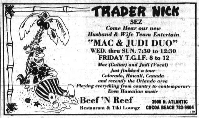 James Billet opened the Beef ‘n’ Reef in Cocoa Beach on September 1973. It featured full Polynesian décor with exotic drinks, food and live entertainment on weekends. Wayne Coombs, legendary Space Coast Tiki carver, provided the initial 12 tall Tikis for the restaurant, as noted in another TC thread posted by kahukini in 2002 (http://www.tikicentral.com/viewtopic.php?topic=289&forum=4&vpost=2724&hilite=beef)