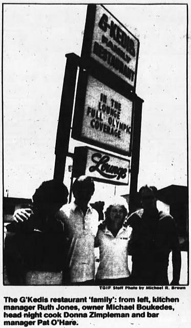 In June 1984, Mike Boukedis announced that he had bought the property formerly known as The Greenhouse Restaurant and Lounge (and originally known as the Beef ‘n’ Reef). In July 1984, he reopened it as the G’Kedis Family Restaurant, already a landmark Cocoa Beach eatery that he relocated to the new property from across the street. The name, G’Kedis, was derived from a contraction of Mike’s father’s name, George Boukedis...