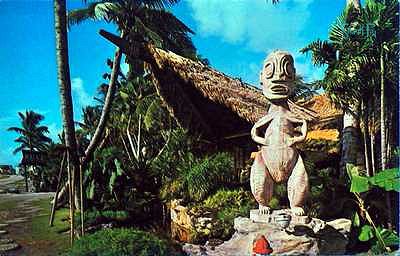 The 23 foot Moai still stands at the south corner of the property. The other piece was in the gardens until a couple of years ago when decades of decay sent it toppling over and broken to pieces. Its place has now been filled by th elarge carving that used to be at the end of the Surfboard bar and in the main dinning room in older pictures. This one from that time is still there in the same spot too: The piece in the left of this card is now in the gardens where the large Barney West used to be: |