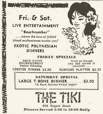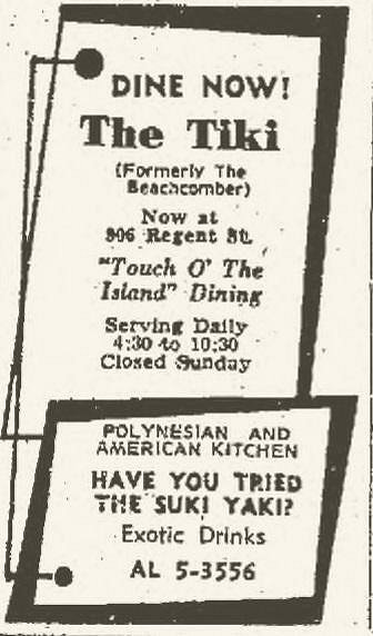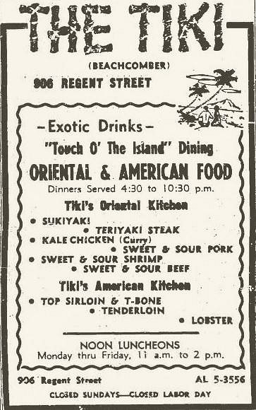 I made some corrections to my original post above and now I have a few new things to add – mostly newspaper advertisements. First, recall that before The Tiki, Matt Pelletter owned an earlier Polynesian restaurant called The Beachcomber and that he had to close this restaurant when the city of Madison wanted to buy (and demolish) the building as part of a city redevelopment project.