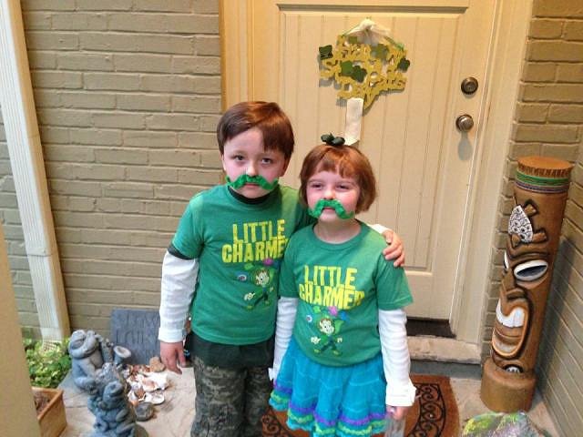 The front door of Nancy Grace, depicting the house Tiki sentinel, in addition to her children celebrating St. Patrick's Day.