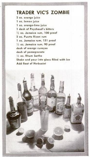 Here's the recipe from the 1947 Bartender's Guide, by Trader Vic. (In the 1972 edition, it had changed to a weaker, juicier recipe.) ZOMBIE (1947 TVBG) This recipe is from the 1952 edition of Ted Saucier's Bottoms Up: ZOMBIE |