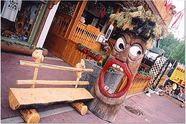 I took these pictures two years ago in the mock-Bavarian town of Kimberley, B.C. The artist is Adi the Yodeling Woodcarver. His shop is nearby but I don't remember that he had anything else that was particularly tiki. Yes, he really does yodel -- I have bought several of his records in thrift stores.