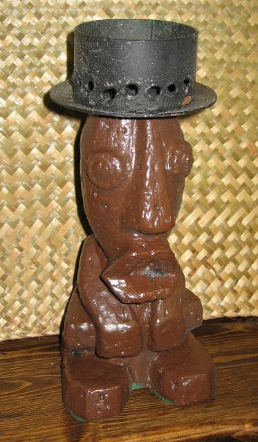 the ku tiki isnt old- it's probably late 90's early 2000's the ku face lamp below it is definately not old. I know because i made those lamps for hala kahiki years ago, about the same time as they were replacing the older damaged table lamps with ones like the standing ku above and mine. |