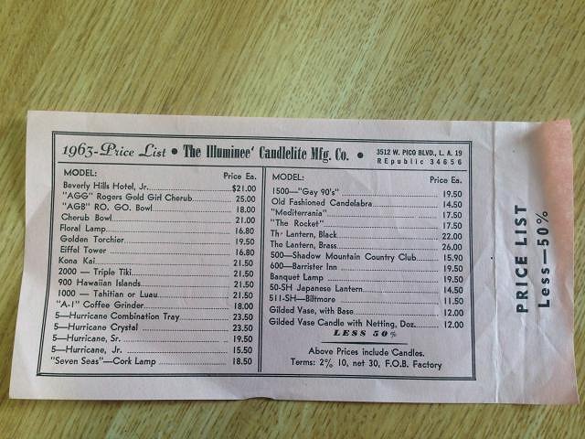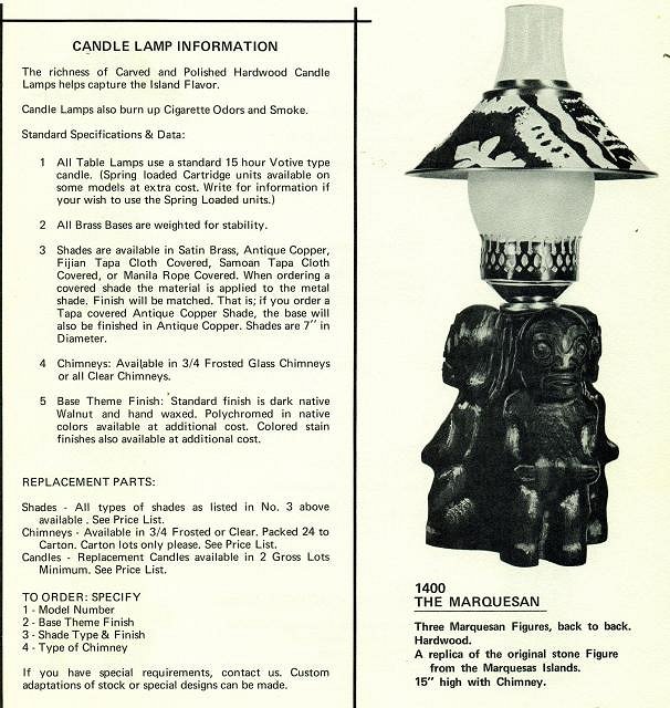 The ceramic Tiki lamps were sold by The Illuminee Candlelite Mfg. Co. which was a custom lamp manufacturer for hotels and restaurants. As well as resellers like Oceanic Arts who used them when outfitting Polynesian themed restaurants.