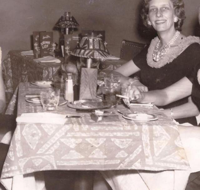 Other than the rope shade, it’s impossible to tell though what the rest of the lamp looked like. A later photo from 1974 shows the Orchids of Hawaii Kon Tiki lamp.