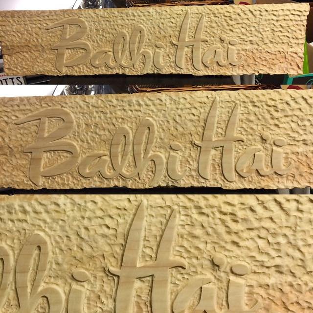 I just finished my second carving project -- a sign for the tiki bar. The wood is a hunk of mystery meat pulled out of a dumpster by a kind employee at a landscape supply yard, a bit of scrap left over from trimming some sort of plank. Alder? Unusually pale redwood? I dunno. The grain was subtle. Didn't seem at all like pine or oak. All the carving was done using a Dremel tool with a flex shaft attachment. Here's photos of the project as it progressed: :down: I created the logo years ago, it's based on lettering from a vintage menu of a place called Bali Ha'i. I drew the lower case "h". I printed it on the inkjet, and then traced it onto the board using carbon paper. :down: I used a pointy triangle bit to edge a smidge around the letters. :down: I used a nice, big oval bit to get this fun, rough-hewn texture all around the background... until my bit came flying out of the Dremel and landed somewhere in the yard. Whoops! :down: While my bit was lost, I switched to cutting out deeply and carefully around the letters using some smaller bits. :down: Found my bit! Here's the sign after all the carving was completed, and after sanding. :down: Two coats of Dark Walnut stain. :down: Three coats of satin finish polyurethane. :down: One coat of primer on the lettering. :down: Three coats of gold paint, and the sign is finished! Next comes getting the sign hung. I need to do some work in the stairwell where the sign will live, mostly mounting lighting directed at the sign. For my next carving project -- I think I might carve the handle on my ice pick. |
