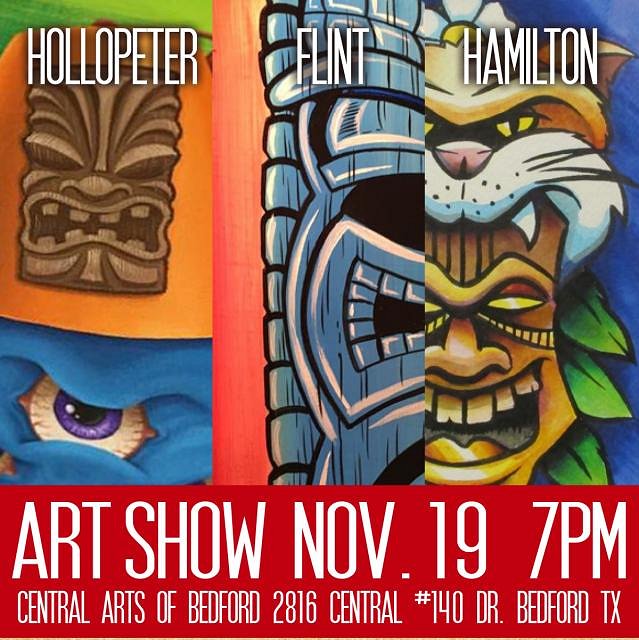 Brave enough to test the thrills of the jungle? Journey deep into the brush with 3 artists as they go in search of ancient tiki jungle treasures! Your safari guides will be Jay Hollopeter, William Flint and Robert Hamilton; 3 art types who figured out that 3 is better than 1 when exploring these dangerous tiki-territories! Jay Hollopeter- works primarily in oils, although he does venture into acrylic, ink, marker, graphite and colored pencil occasionally. He keeps his color palette bright and vibrant. Jay’s subject matter is influenced by anything from monsters and hot rods to pop culture and space aliens. Humor has always been very important to him as a subject, so you'll see it as an underlying tone in almost all of his work. William Flint- Earned his BFA in Art from SMU. “Flint” as he’s known, has been an editorial cartoonist for over 30 years. An illustrator of children's books, Flint is an avid low-brow kitsch painter that doesn't take himself seriously, but as for his art, now that’s serious! Robert Hamilton- Long time painter and musician, “Hami” has been circling the tattoo and hot rod world for years vending at shows, playing live in various acts and showing in spaces here and there across Texas. His passion for all things tiki and the dark jungle have led him to this most recent excursion with new pals, Jay and Flint and his musical collaboration with “the Tiki Torches.” We hope you’ll join us on opening night as the Central Arts of Bedford and the Bedford Cultural Committee present the “Forbidden Tiki Fever Jungle” exhibition on Saturday November 19th from 7pm - 11pm. Slithering Snacks and Jungle Juices will be served! We’re also excited to announce that the savages will be tamed by the sounds of “The Tiki Torches,” performing live exotica, lounge and tiki tunes from 9pm - 10pm. http://www.thetikitorchesband.com Central Arts of Bedford is located at 2816 Central Rd, Suite 140 in Bedford Texas. Bring your wallet, your keen eye for cool and a companion and make plans to walk away with one of a kind art to decorate your walls just in time for Christmas! There will be many sizes, many mediums to choose from, all priced to make their way home with you! Take advantage of these roaring deals! (wink!) Your safari guides will be on hand to assist you during your deep, dark, exotic, tiki jungle adventure! Let’s do this! The jungle awaits! http://www.artwork-a-go-go.com/