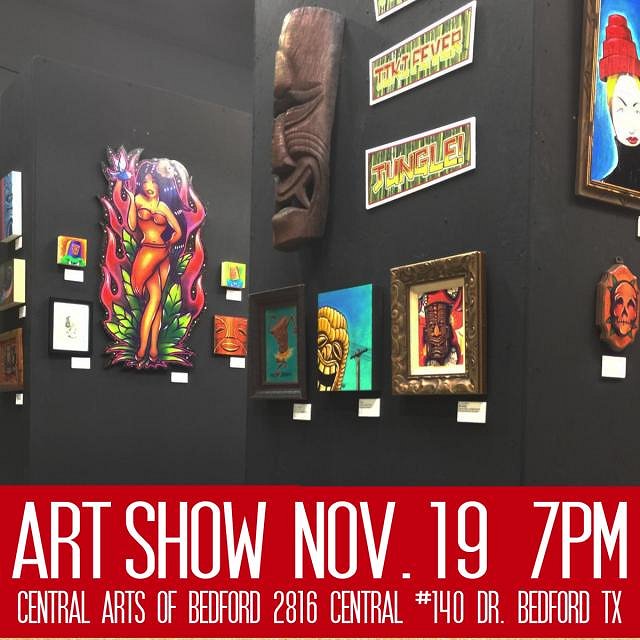 Love to see some Texas tiki folks out tonight in Bedford Texas! The jungle comes alive with tiki art! Live music! Polynesian Pinball! Dancing tikis! The savages are going bananas at Central Arts of Bedford!