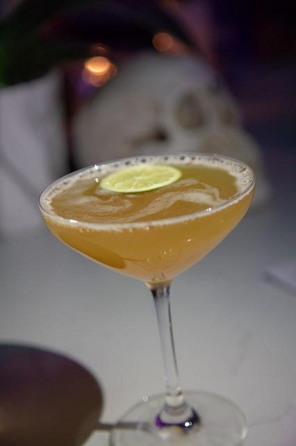 It's located in the basement beneath Capital Grille. It's dark, which any good tiki bar should be. It's also noisy. Incredibly noisy. The floor was stained concrete, the walls covered with faux stone and the high ceilings are industrial and bare. It's the Spartan aesthetic that ensures every noise will echo and amplify, with absolutely nothing to break it up. I hate restaurants with this type of design, but for a tiki bar, which is all about escapism, it was particularly egregious. The music playing, when it could be heard, is Top 40 pop. Backstreet Boys. Justin Bieber. There is multicolored lighting throughout. The bar had thatch above it, which is pretty much standard for even faux tiki bars. The most striking element in the place are skull columns. The two structural support columns in the middle of the floor space have barrels (rum barrels?) at the base, with the upper portion wrapped in resin skulls. That's it for the decor. There are colored ball lights hanging from the ceiling, but there's no netting, so they're not even pretending to be float lamps. I am not exaggerating when I say I could strip all "exotic" decor from the place in under an hour to convert it to a generic Austin bar. Let me make it clear: There was not a single tiki in the entire "tiki bar."